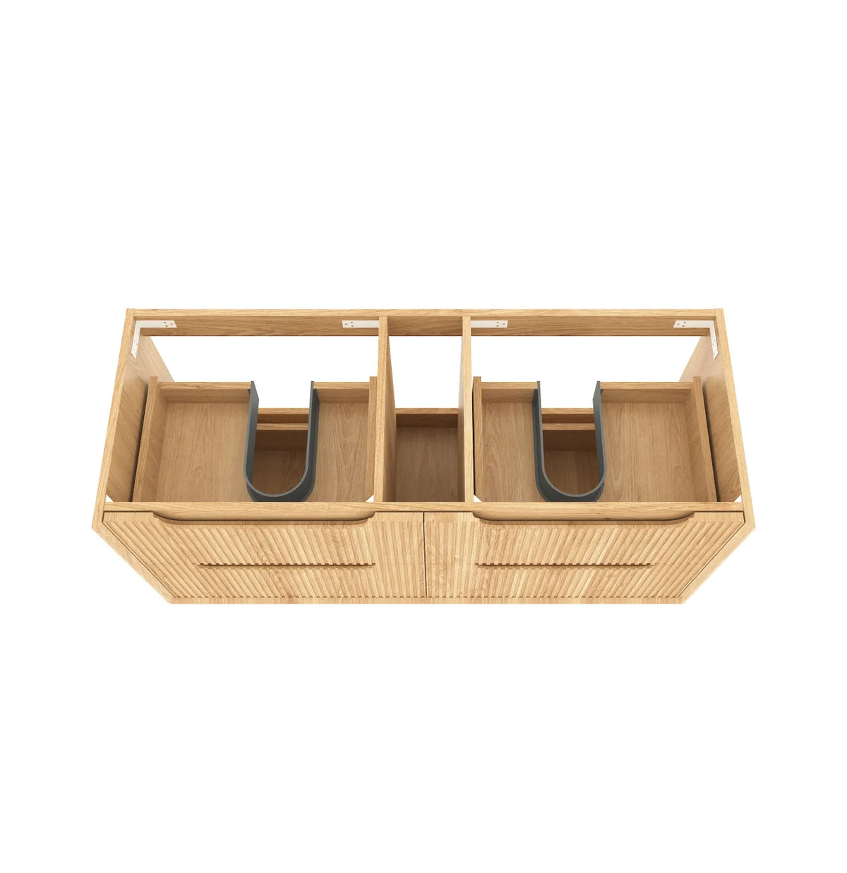 Crafted from premium moisture-resistant plywood, the Byron vanity is built to perform in humid environments while retaining its structure and finish for years to come. The vertical fluted veneer introduces subtle architectural rhythm, while the natural oak tone softens the space with organic warmth.